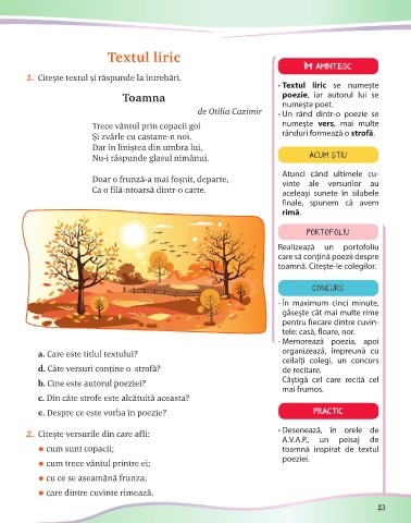 2. Citește versurile din care afli: • Desenează, în orele de